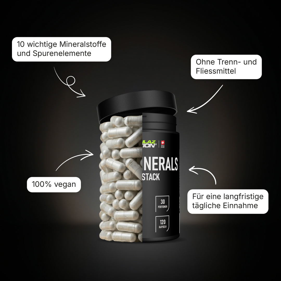 Mineralstoffe und Spurenelemente sind lebenswichtige Nährstoffe für zahlreiche Körperfunktionen wie den Energiestoffwechsel, die Muskelfunktion, das Immunsystem und den Zellschutz. Multiminerals kombiniert Magnesium, Kalzium, Kalium, Zink, Eisen, Selen, Jod, Kupfer, Mangan und Chrom in optimal abgestimmter Dosierung, um den Körper täglich umfassend zu unterstützen. Um eine bestmögliche Aufnahme sicherzustellen, verwenden wir ausschliesslich Rohstoffe mit hoher Bioverfügbarkeit. Besonders bei einem aktiven Lebensstil oder einer einseitigen Ernährung hilft Multiminerals, Versorgungslücken gezielt zu schliessen und trägt so zu starken Knochen, gesunder Haut, einem widerstandsfähigen Immunsystem, mentaler Leistungsfähigkeit und einem ausgeglichenen Stoffwechsel bei.1 2 3 4 5 6 7 8